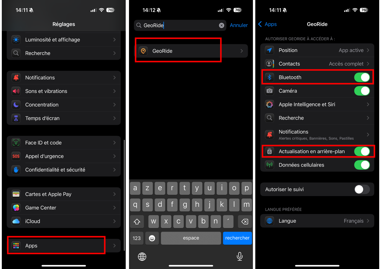 👉 3. Activer le Bluetooth et l’Actualisation en arrière-plan dans les réglages GeoRide