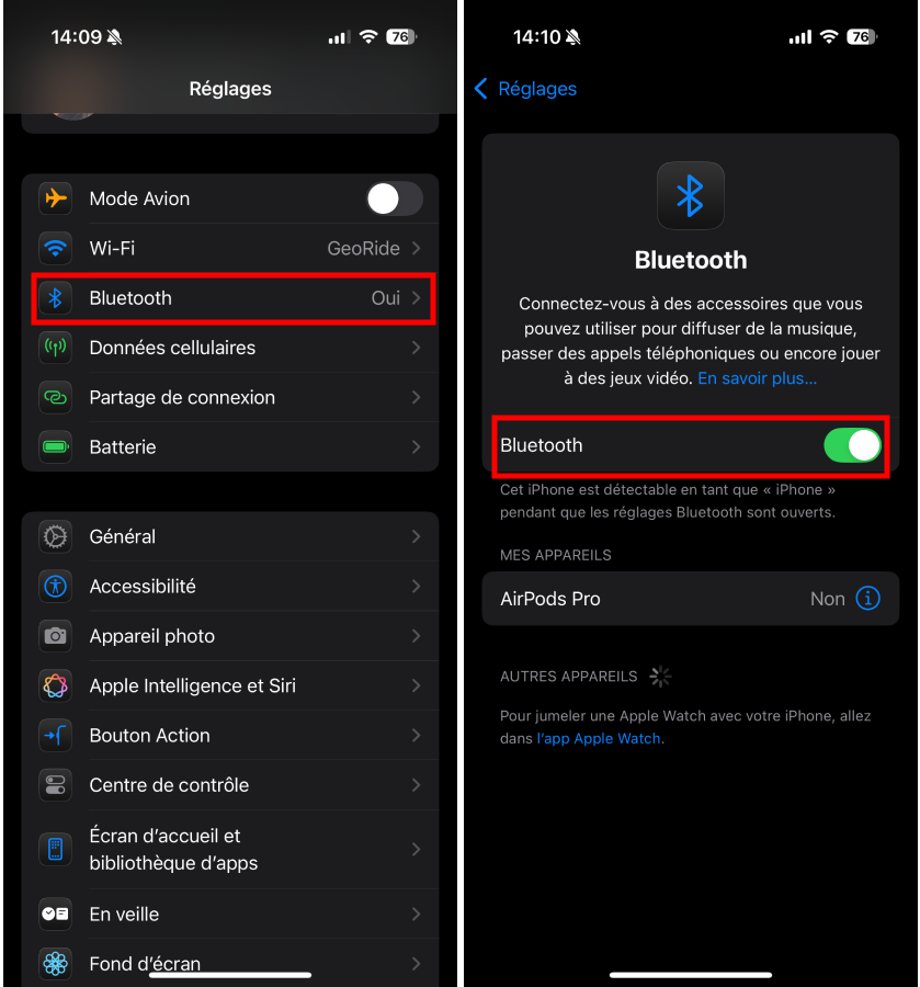 Vous ne devez jamais désactiver le Bluetooth de votre téléphone si vous voulez que votre téléphone soit reconnu par votre GeoRide.