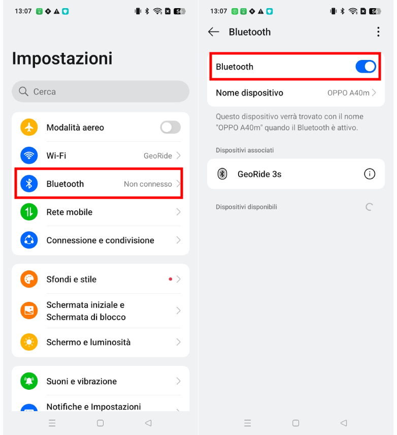 Non disattivare mai il Bluetooth del telefono se desideri che il tuo smartphone venga riconosciuto dal GeoRide.